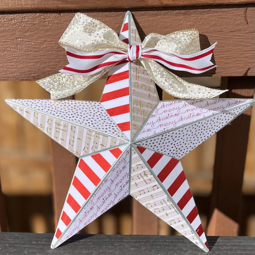 12” Handcrafted Star-made from rolled sheet metal, flattened and cut by hand, edges filed, and bent one section at a time. Uniquely designed with decorative paper and hand-tied bow.