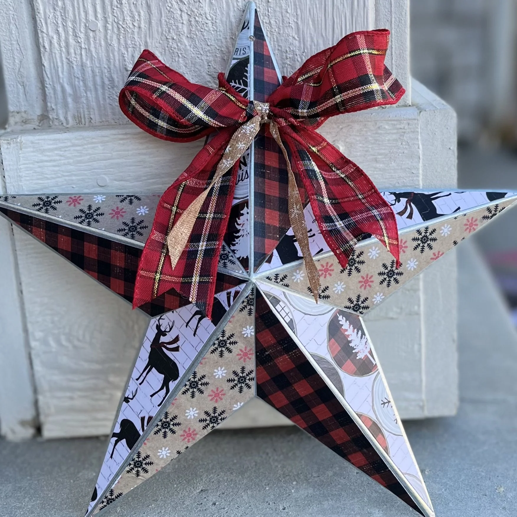 12” Handcrafted Star-made from rolled sheet metal, flattened and cut by hand, edges filed, and bent one section at a time. Uniquely designed with decorative paper and hand-tied bow.