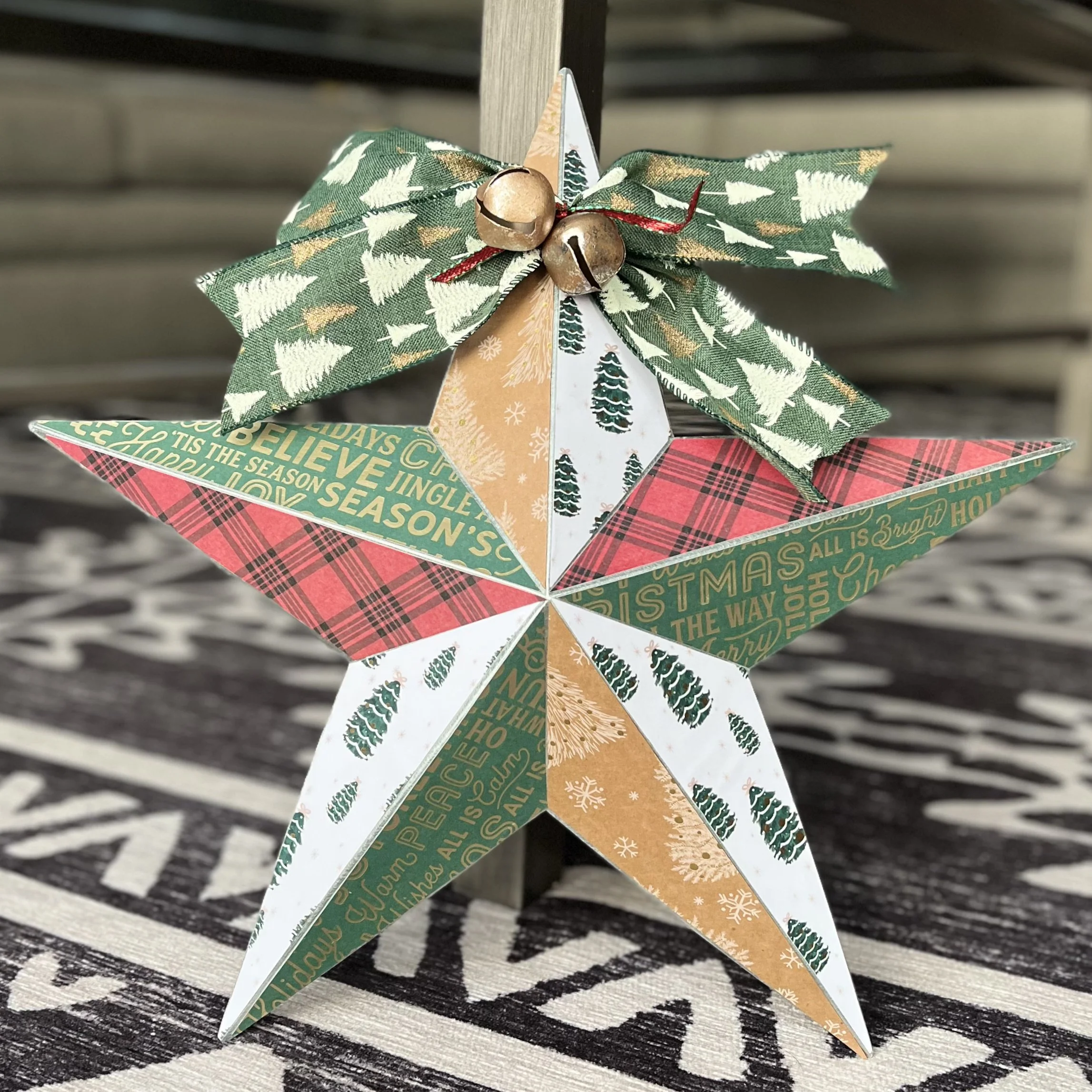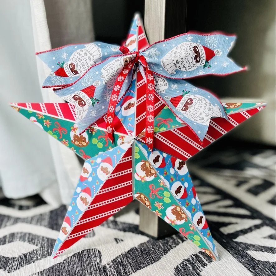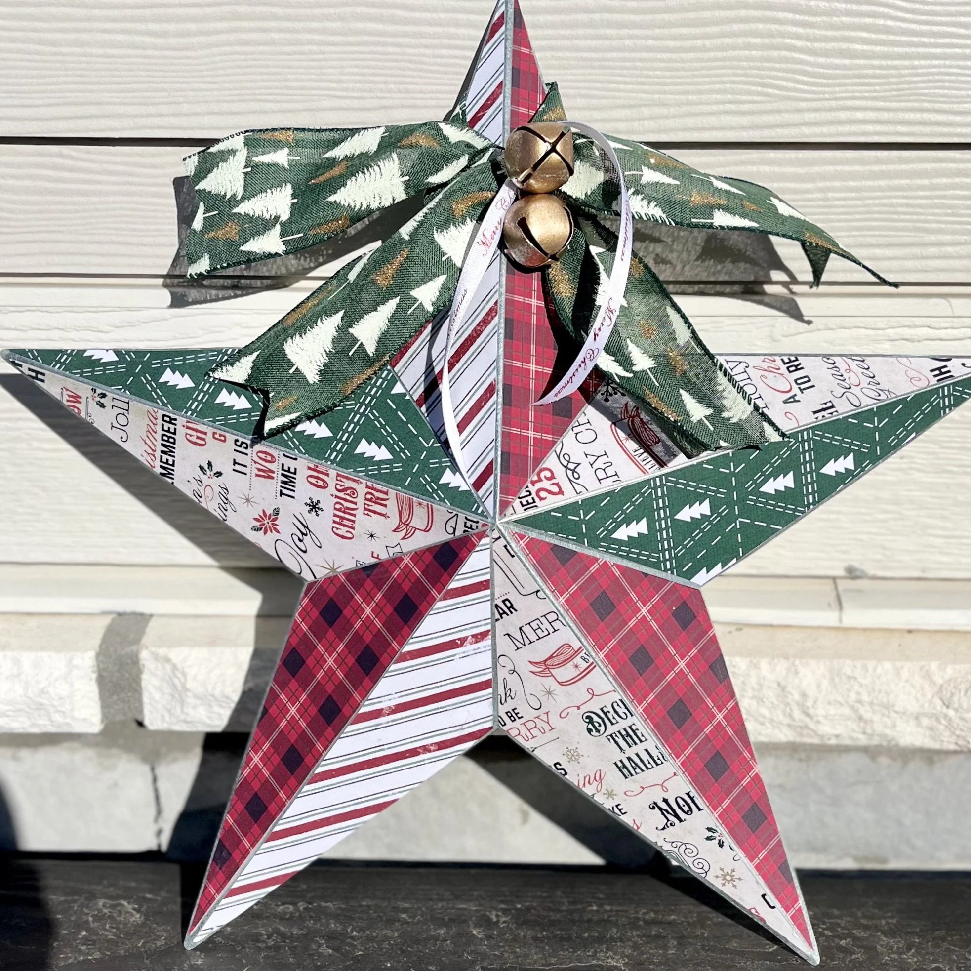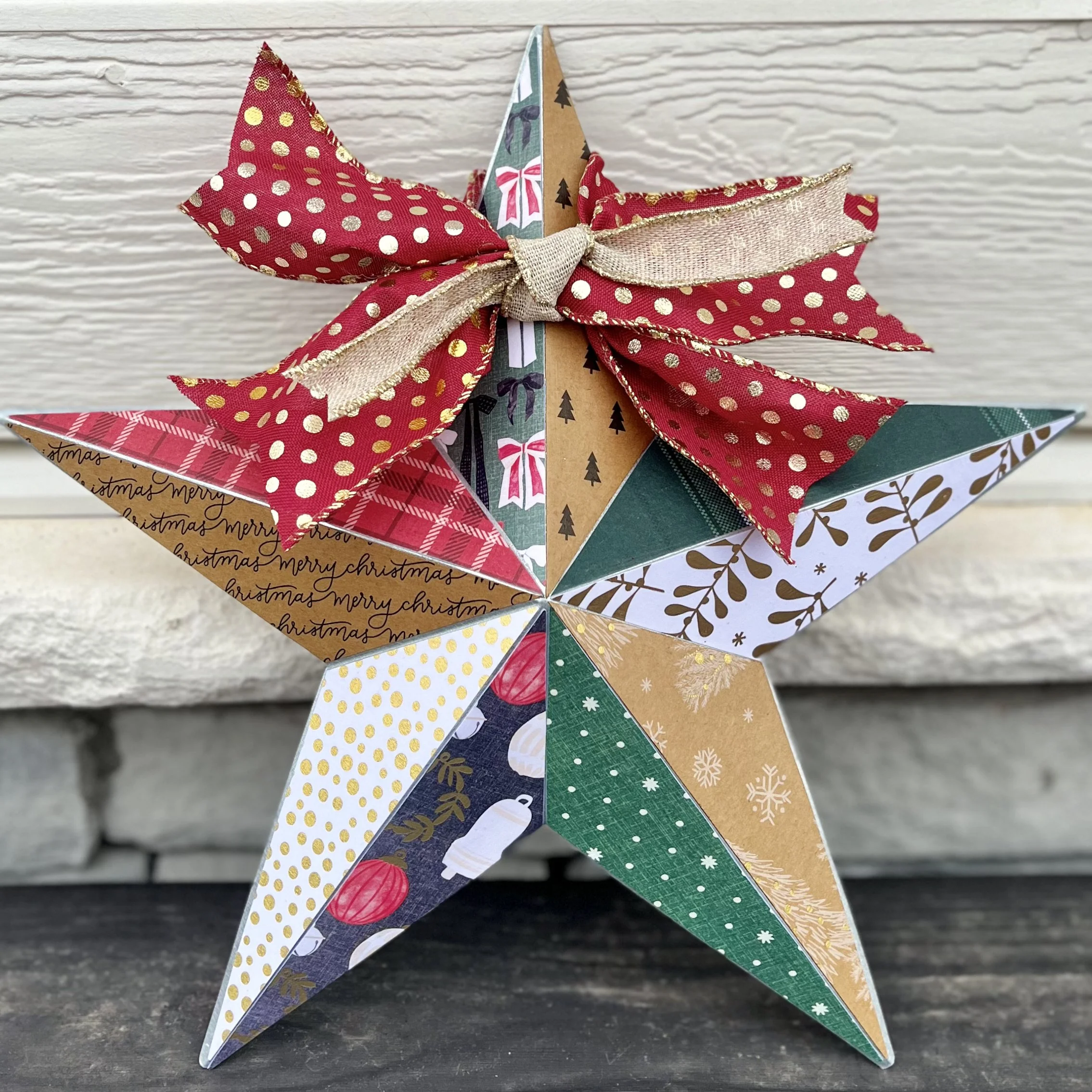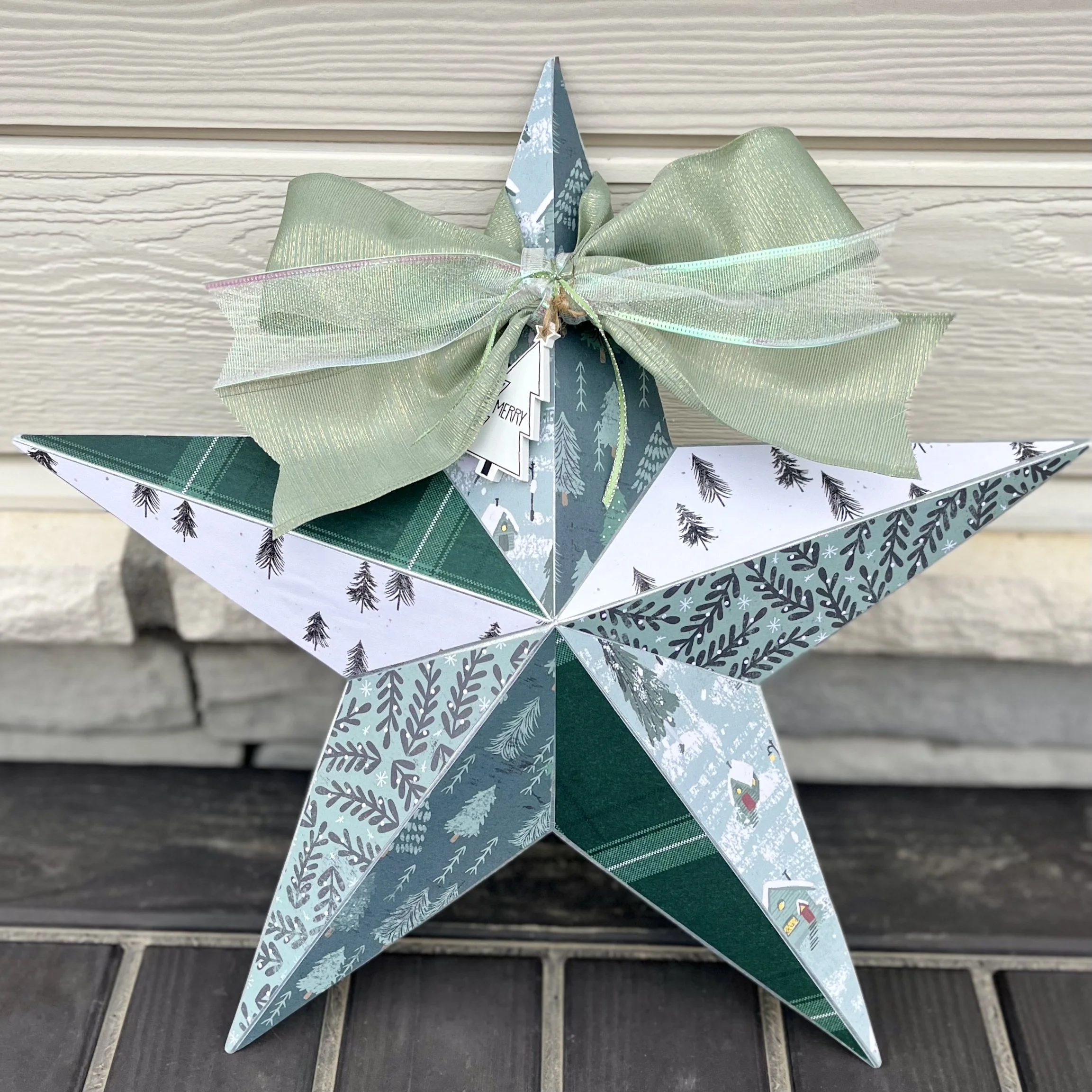 20” Handcrafted Star-made from rolled sheet metal, flattened and cut by hand, edges filed, and bent one section at a time. Uniquely designed with decorative paper and hand-tied bow.